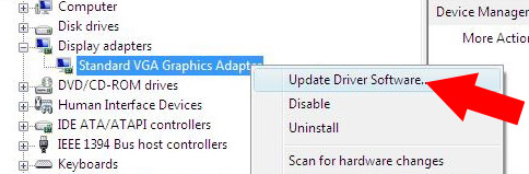 3. A device manager will open, right click on standard VGA and select update driver.